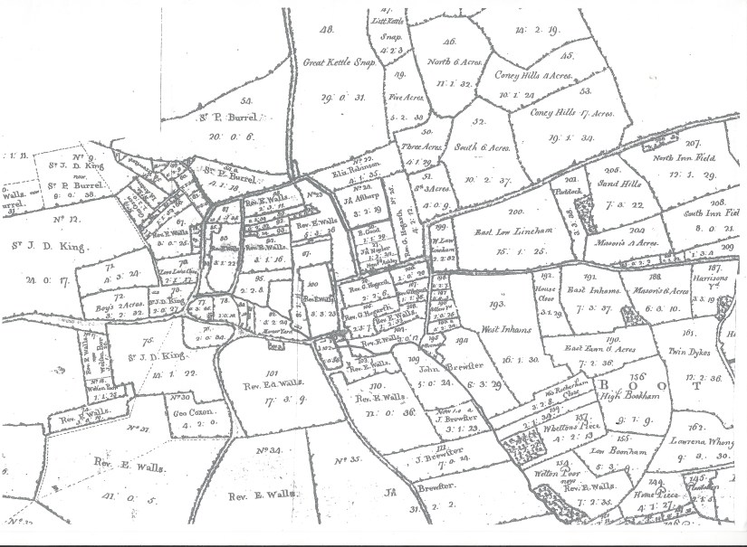 Curiously, the Church is not drawn on its plot (78), possibly as it was derelict when the map was produced. The adjoining plot (77) now occupied by Baytree cottage (and later divided West – East) has a very small plot (79) in the South East which is owned by the Lady of the Manor, it is not clear what this is for or whether it had a building on the site, but as it adjoined the Church yard it may have had a religious significance such as a tomb or chapel.