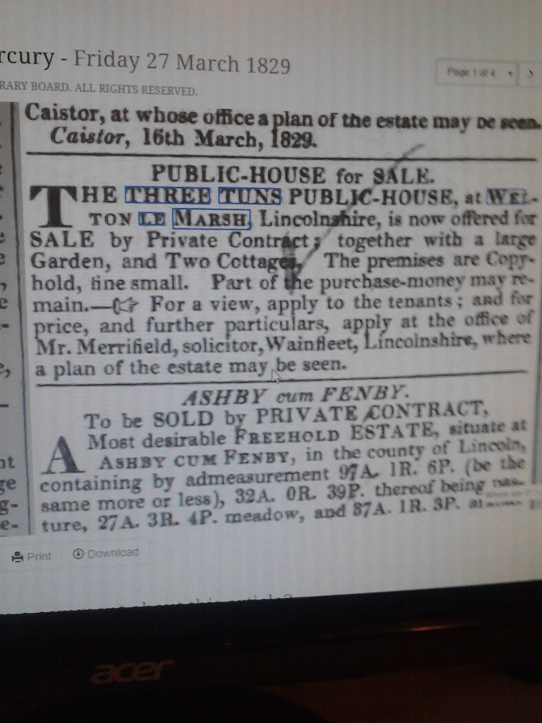 The earliest recorded inn in Welton le Marsh was the ‘Three Tuns’. It is not known where this was situated but there is evidence of an inn in one of the houses next to the post office. The for sale advertisement below, shows that the Three Tuns was open until at least 1829.