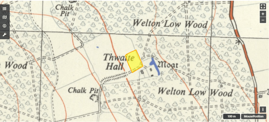 Situated in the middle of Welton Wood is an ancient farm-house known as Thwaite Hall. Little seems to be definitely known about the past history of this white-washed brick. The present structure is not of a great age – a little over a hundred years perhaps – but is obviously built on the site of much earlier buildings. In the moat which surrounds it, traces of early foundations have been found and a very old barn at the rear of the house contains a stone bearing the date of 1739, although the barn itself patched as it is would seem to be very much older than that.
